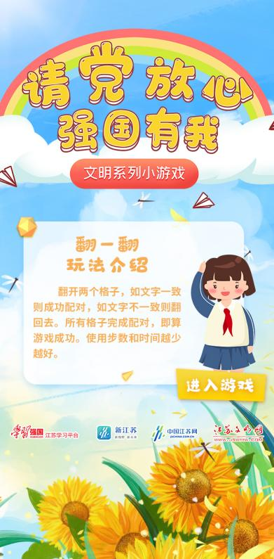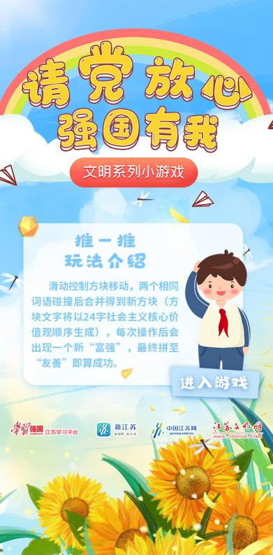 少年强则国强,社会主义核心价值观是青少年基础教育的立足点,抓好青少年社会主义核心价值观教育,4月25日,中国江苏网联合江苏文明网特别策划制作“请党放心 强国有我”——24字社会主义核心价值观学习融媒小游戏正式上线!通过青少年喜闻乐见且易学易懂的方式加以呈现,寓教于乐,将“三个倡导”24个字的价值标准向青少年教会清楚,进一步提升青少年深入学习社会主义核心价值观并牢记于心。