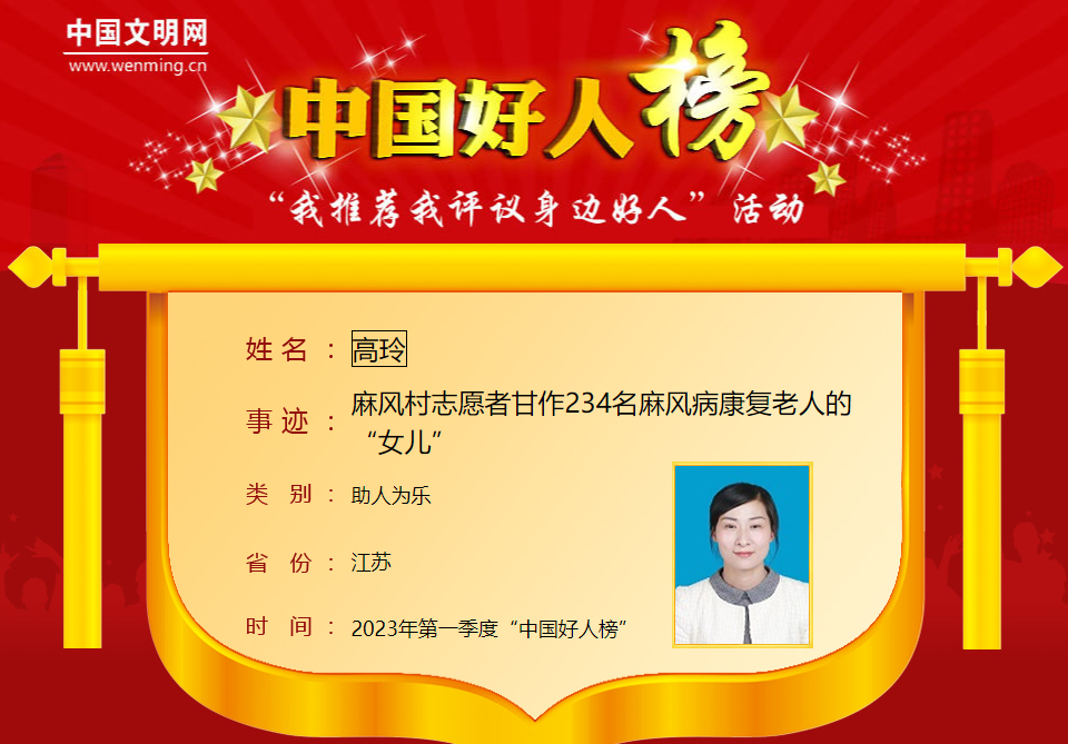 高玲(已故),女,1976年8月生,中共党员,生前系江苏省泰州海关驻泰兴办事处工作人员。从2009年开始,高玲甘作234名麻风病康复老人的“女儿”,只要有空就去村里为老人们洗衣服、剪指甲、打扫房间,笔记本上密密麻麻记录着老人们的需求。她还连续11年自费请戏班子来麻风村演出,丰富老人们的精神文化生活。2014年,她成立志愿服务队,吸引217名志愿者加入其中。2023年春节前夕,她最后一次来到麻风村为老人们料理家务,2023年1月22日,突发疾病去世。高玲曾荣获“江苏省道德模范提名奖”“江苏省优秀志愿者”等荣誉。
