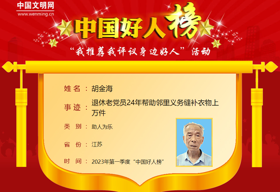 胡金海,男,1947年6月生,中共党员,江苏省扬州市曲江街道顾庄新村居民。20多年前,胡金海病退回到扬州休养。身体康复后,闲不住的胡金海便想为左邻右舍做点力所能及的事。他年轻时学过裁缝手艺,于是便在自家车库放上缝纫机,连续24年为街坊邻里免费缝补衣物上万件。空闲时间,他还主动带头参加社区环境整治、路面执勤等志愿服务活动。胡金海曾荣获“江苏好人”等荣誉。