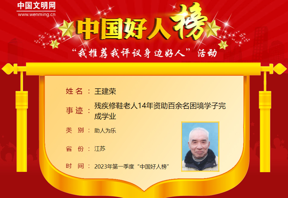 王建荣,男,1945年10月生,江苏省淮安市淮安区淮城街道闸北村村民。王建荣幼时因患小儿麻痹症导致下肢残疾,经过努力成为一名修鞋匠。自力更生的同时,他时刻不忘兼济他人,在汶川地震、雅安地震、云南地震中倾其所有支援灾区。他还主动伸手帮助困难乡亲、学生、路人,在过去的14年中,他累计捐款8万余元,资助100余名困境学子完成学业。王建荣曾荣获“江苏好人”等荣誉。