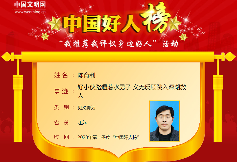 陈育利,男,1983年10月生,江苏省无锡柴油机厂员工。2022年8月17日,陈育利在路过无锡大剧院附近时听见落水声响,发现一名男子在湖里挣扎,形势十分危急。他立即报警,随后跳进湖中,往湖心游了20余米后终于抓住男子衣服,将其拉至岸边,并和随后赶到的警察一起将落水男子救上岸。陈育利曾荣获“江苏好人”等荣誉。