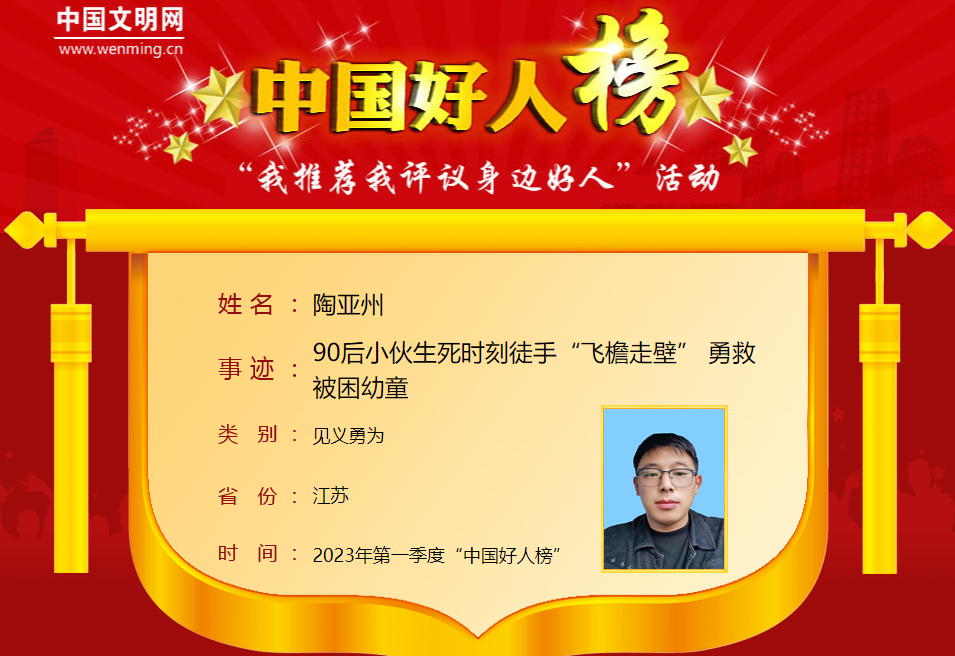 陶亚州,男,1994年12月生,江苏浩源电力工程有限公司员工。2022年11月19日,陶亚州在小区楼下听到孩子哭喊声,循声发现对面楼一名幼童身子悬挂在4楼窗户外,脖子卡在防盗窗底部,情形十分危急。他立即冲到事发楼层,沿着墙壁爬到幼童身边,抱住幼童双腿向上托举,近5分钟后成功将其救出。陶亚州曾荣获“江苏好人”等荣誉。