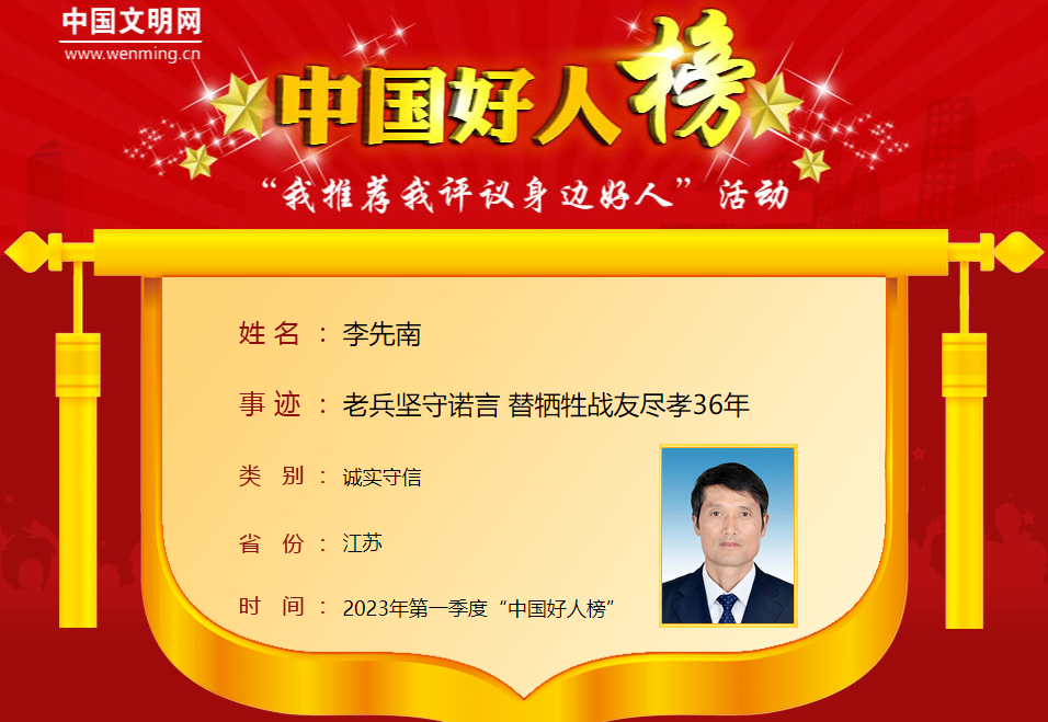 李先南,男,1964年8月生,中共党员,国网江苏省南京市江宁区供电公司职工。李先南19岁参军奔赴前线,5位同乡战友相互承诺,如果牺牲由回乡的兄弟帮忙照顾父母。1987年,李先南返回南京,但一起从江宁走出去的5个兄弟,只有2人回来了。李先南牢记着和战友们的“生死之约”,回来安顿好工作和住处,多方奔走帮助牺牲战友处理安葬事宜,之后36年如一日照看其中一名牺牲战友的父母。