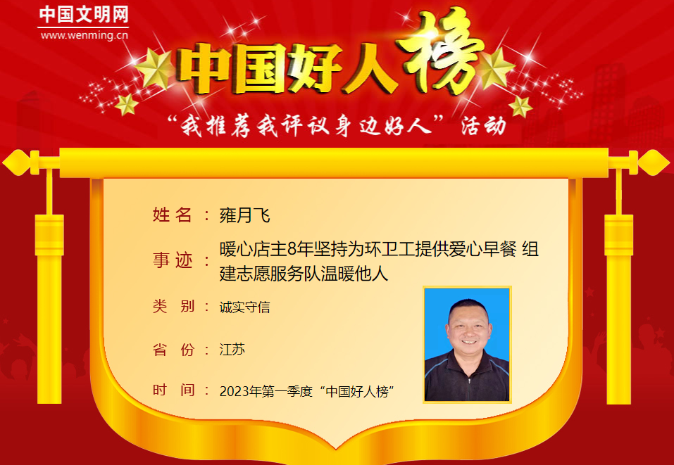 雍月飞,男,1970年12月生,江苏省宿迁市泗洪县青阳街道居民。2015年冬天起,经营着一家早餐店的雍月飞主动邀请环卫工人到店里免费就餐,并承诺:所有来店里吃饭的环卫工一律免单。8年来,他的早餐店已累计接待环卫工人7万余人次,累计开销近30万元。雍月飞曾荣获“江苏好人”等荣誉。