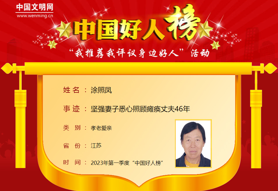 涂照凤,女,1951年12月生,江苏省南通市海安高新区园庄村村民。1977年,涂照凤的丈夫复发脊柱骨髓炎后高位瘫痪,生活不能自理,涂照凤独自挑起了家庭重担。46年来,她种田、养猪补贴家用,抚养两个孩子长大,每天为丈夫洗脸、刷牙、喂饭、擦身,每隔两小时为他翻身、按摩。丈夫多次旧病复发,她每次总是彻夜陪伴、精心照顾,一次次从死神手里夺回丈夫。涂照凤曾荣获“江苏好人”等荣誉。