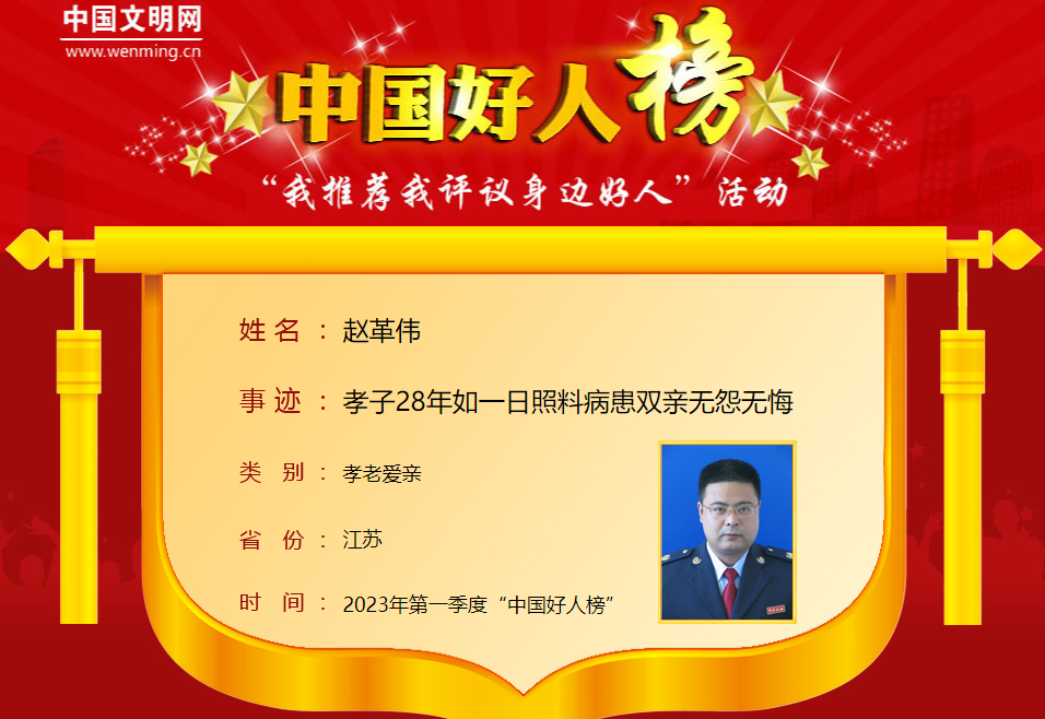 赵革伟,男,1973年5月生,中共党员,江苏省常州市高新区国税局税源管理二科副科长。28年前,赵革伟的父亲突然中风丧失劳动能力,他主动承担起照顾父亲的责任,为父亲翻身、擦洗、按摩。父亲患病7年后,母亲因类风湿性关节炎卧床不起,他同时照料两位老人,带他们遍访周边名医,无怨无悔、不离不弃。赵革伟曾荣获“江苏好人”等荣誉。