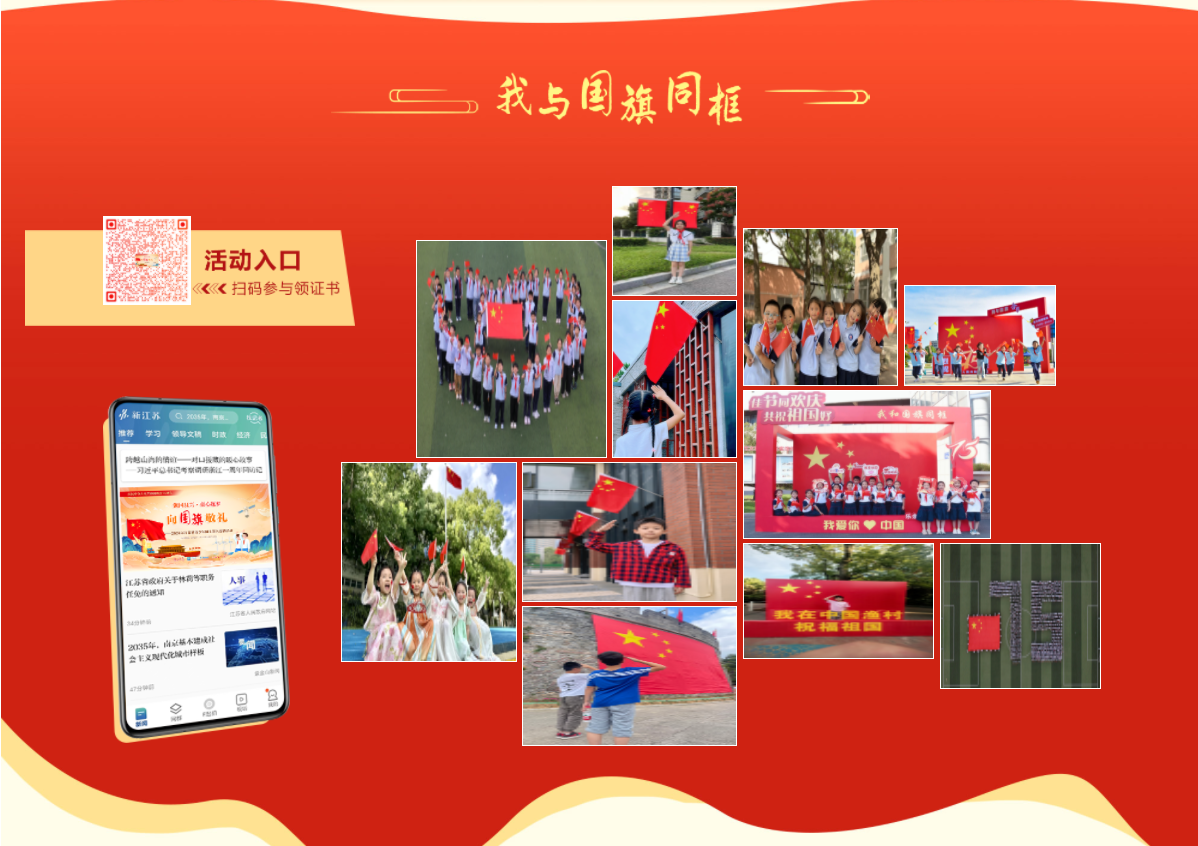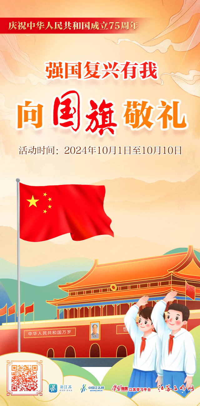 为热烈庆祝中华人民共和国成立75周年,激励引导广大未成年人听党话、跟党走,刻苦学习,树立理想,砥砺品格,增长本领,争做德智体美劳全面发展的社会主义建设者和接班人。2024年10月1日—10日期间,江苏文明网集中开展“向国旗敬礼”活动,欢迎全省广大青少年朋友踊跃参与,向鲜艳的五星红旗敬礼,向伟大的祖国祝福。