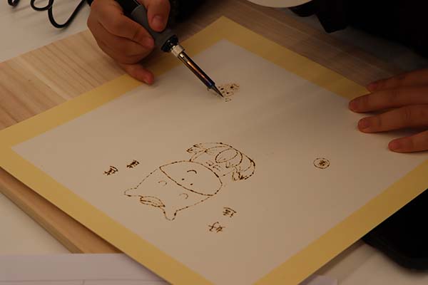 掌握基本技法后,大家在老师的鼓励和协助下,开始独立或协作完成自己的烙铁画作品。有人选择临摹简单的马年吉祥图案,也有人尝试勾勒生动的动物轮廓。创作过程中,现场氛围专注而热烈,空气中弥漫着淡淡的木质焦香,一幅幅深浅有致、个性鲜明的烙画在笔尖缓缓浮现。参与者纷纷表示,亲手通过温度掌控让画面逐渐显现,不仅领略到非遗技艺的精妙,也感受到专注创作带来的内心宁静与成就感。