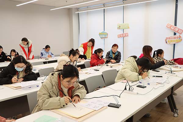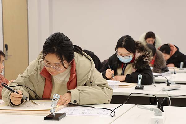 授课老师首先深入浅出地介绍了烙铁画的历史渊源、艺术特点与文化价值,参与者们认真聆听,对这项传统技艺的发展脉络与艺术特色形成了系统的认识。随后,在老师的耐心指导下,大家初次尝试使用电烙笔,从执笔姿势、运笔力度入手,逐步练习直线、曲线、点染等基础笔触。老师特别强调,温度控制是烙铁画创作的核心,不同的温度、速度和角度会在木料上呈现出从浅黄到深褐的丰富色调,直接影响作品的层次与质感。参与者们在练习板上反复尝试,逐渐熟悉工具特性,真切体验到“以火为墨”的独特趣味。