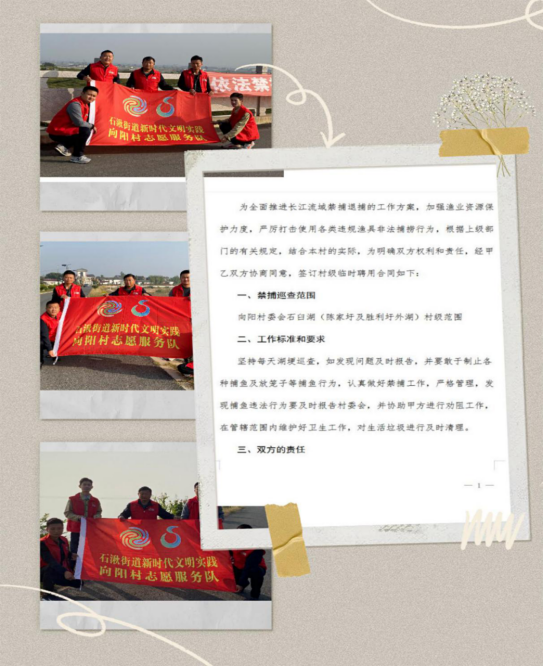 转机很快到来。一条关于“长江十年禁捕”的政策消息在这座临湖的小村落里飞速传递着,当黄平平听到消息的第一刻,一个崭新想法诞生了,“保护我们的石臼湖刻不容缓,在禁捕政策的指引下,我们要积极发动志愿者力量,共同守望我们的母亲河。”一支由青年党员干部为主体、村里青年人广泛参与的“蓝色向阳”志愿服务队成立了,成立当天下午,蓝色向阳志愿者们就开展了首场湖边垃圾清理活动,整整四个小时,近30名志愿者分布在各个点位,集中作战,对石臼湖开启了一场“闪电美容行动”。塑料瓶、烂渔网、破胶鞋等一堆腐烂垃圾的集中清理,让石臼湖焕发新颜。志愿者们集中清理十几箱垃圾,“丰硕”的战果激起了大家更深忧虑。“看着成堆垃圾,志愿者很心痛,清理河畔的心情更迫切。”