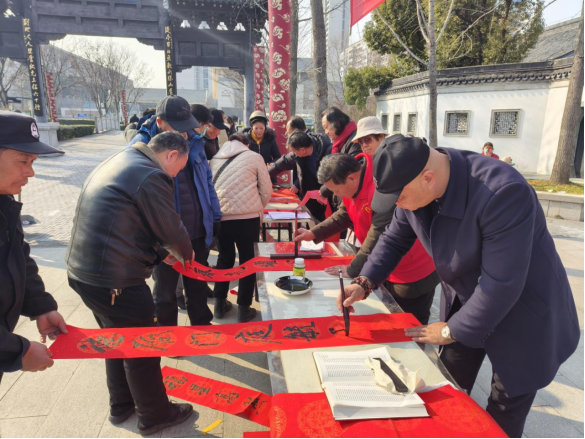 在欣赏年画书画作品的同时,现场组织开展写春联、送年画等文化惠民活动。“龙腾虎跃千家喜风调雨顺万户春”“迎新春江山锦绣辞旧岁事泰辉煌”……一笔一墨彰显书法魅力,一纸一砚谱写美好愿景,书法家们挥毫泼墨,很快,一幅幅充满吉祥寓意的春联和欢乐喜庆的年画送到群众手中。