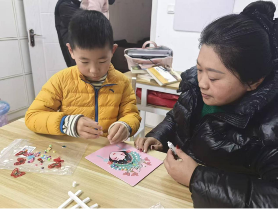 活动现场,志愿者首先向孩子们介绍了京剧脸谱的历史渊源、色彩寓意及艺术特色,让大家在趣味讲解中感受国粹魅力。随后,在志愿者的耐心指导下,孩子们拿起彩珠、亮片、布艺蝴蝶等材料,通过粘贴、点缀、装饰等步骤,将传统京剧花旦形象与现代手作创意相结合,精心制作属于自己的非遗手作作品。从选料搭配到细节调整,孩子们专注投入、互帮互助,现场氛围温馨而热烈。