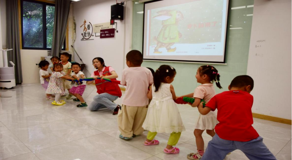 书香滋润童年,阅读丰富人生。为引导家长培养孩子爱阅读、会阅读、乐阅读的习惯,近日,南京市浦口区桥林街道兰花塘社区新时代文明实践站联合南京市少儿图书室开展“故事里的音乐王国”亲子阅读活动。老师以图片+互动的方式吸引家长和小朋友们认真倾听绘本故事,通过提问鼓励小朋友们踊跃发言,跟着绘本的主线不断探索。同时,带领小朋友们使用响板和串铃演奏《拔萝卜》并组织大家使用彩虹绳进行“拔萝卜”的游戏,不仅让家长和小朋友们感受到音乐的魅力,还让小朋友们学会了团队协作。