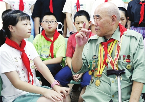 昨天,苏州市新康实验小学校五(1)班举行主题班队课,江苏省军区苏州第三干休所八路军老战士于芝林给少先队员们讲述抗战故事。(记者 华雪根 摄)