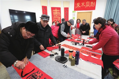 昨日,平江街道新湘苑社区6位草根书法家,在室内写起了春联,迎接“牛”年的到来,为广大辖区居民送上新年的祝福。(记者 张健 摄)