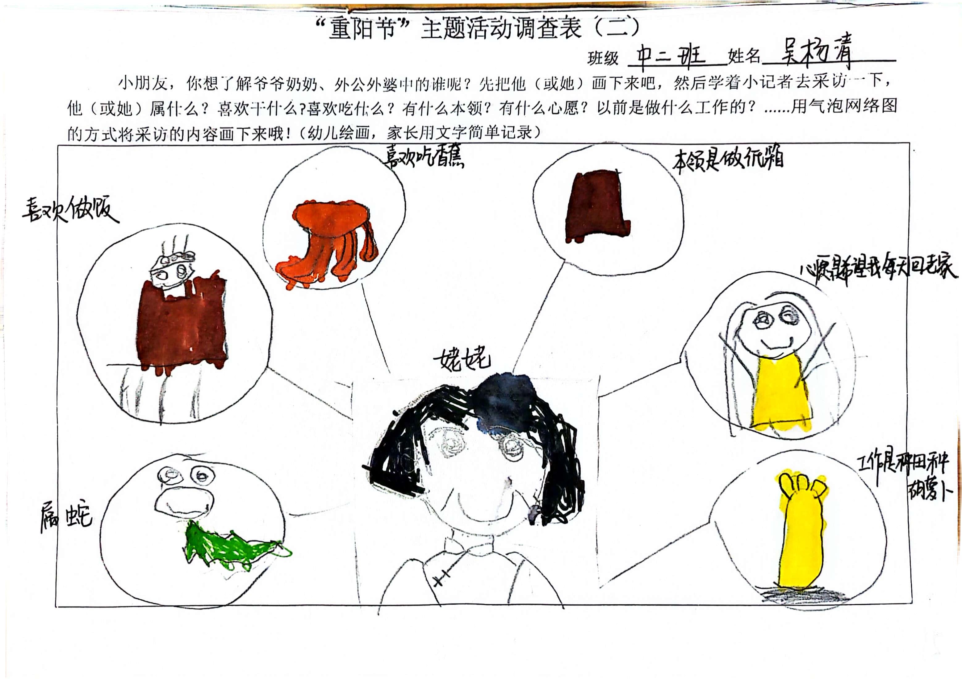 活动启动前一周,各班已开启“重阳文化探寻”行动。教师通过绘本故事《重阳节的传说》、动画短片《老人与山》,引导幼儿了解登高、赏菊、吃重阳糕的习俗;孩子们化身“小小调查员”,采访爷爷奶奶“年轻时的故事”“最喜欢的节日活动”,并用彩笔在画纸上勾勒“我眼中的重阳节”——有的画祖孙登高望远,有的画全家围坐吃糕,稚嫩笔触满是温情。