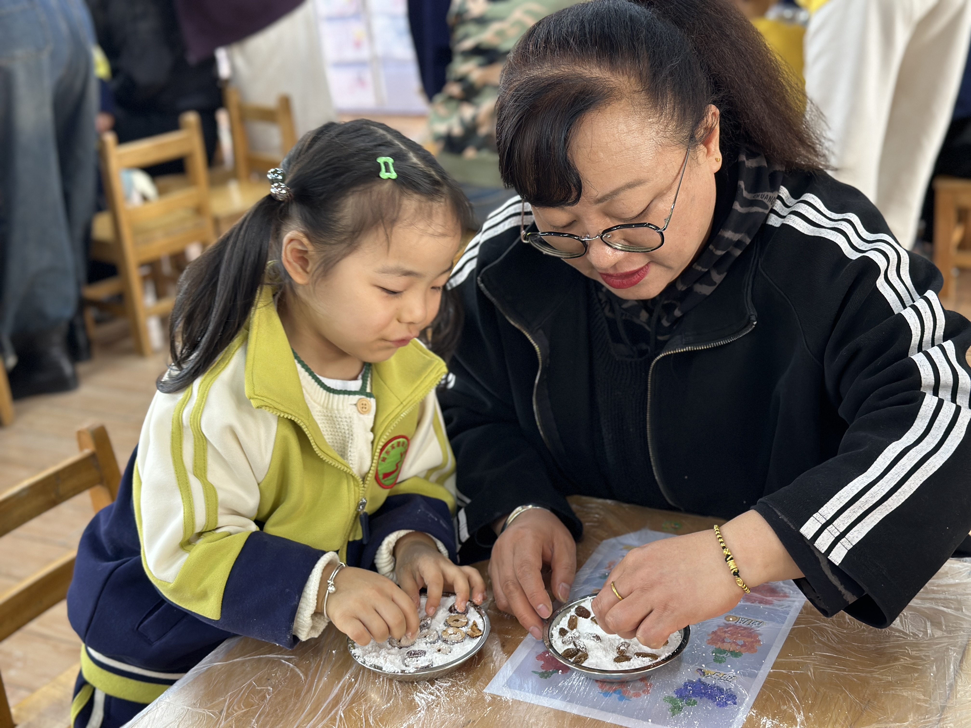 10月28日当天,幼儿园变成“温情乐园”,亲子活动好戏连台。在“舌尖上的重阳”区域,蒸笼冒着热气,孩子们踮着脚尖帮爷爷奶奶揉面团,小心翼翼地在糕上点缀红枣、葡萄干,“奶奶,这个糕要蒸多久才会甜呀?”“我们一起等它变胖好不好?”祖孙间的对话充满童趣;蒸好的重阳糕出锅时,孩子们第一时间递到祖辈嘴边,软糯的糕点混着暖心的举动,让不少家长红了眼眶。
