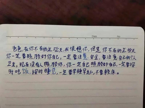 “爸爸,在你不在的这些天,我很想你,你一定要照顾好你自己,一定要注意安全...一定要按时吃饭、按时睡觉,一定要早睡早起...”短短的一份信,不到100个字,却用了5个“一定”,字里行间都透露出了写信人浓浓的思念与牵挂。