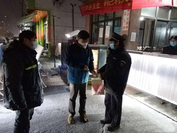 “虽然下着雪,但我们的心里啊是暖和的,感谢街道党工委,也请你们放心,我们一定守好小区的门”东冠逸轩小区保安向街道致谢。