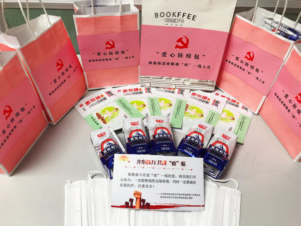 这是一份特殊的防疫包,疫情当前、物资匮乏,防疫包里的酸奶由团市委联合江苏商联超市、经发办李晓梅捐赠,包装纸袋是由杨冉和甜品经营商户赠送,口罩由辖区爱心居民捐赠,暖宝贴由党政办集体捐赠,一份份爱心汇聚成防疫暖流,由街道班子成员带队,顶着大雪送达至每一位一线人员的手上。