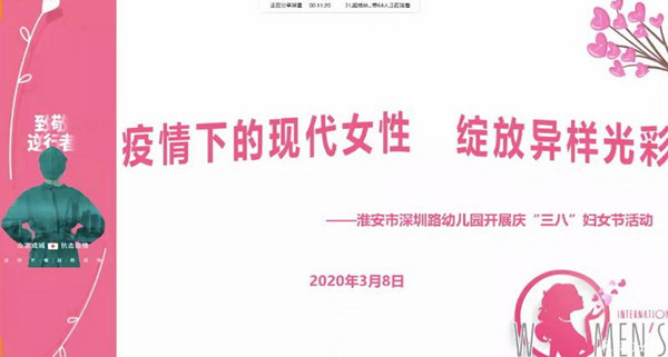 为响应国家号召,丰富疫情下教职工精神生活,增强团队凝聚力,3月8日,淮安市深圳路幼儿园开展了“疫情下的现代女性·绽放别样精彩”线上“三八”节活动。