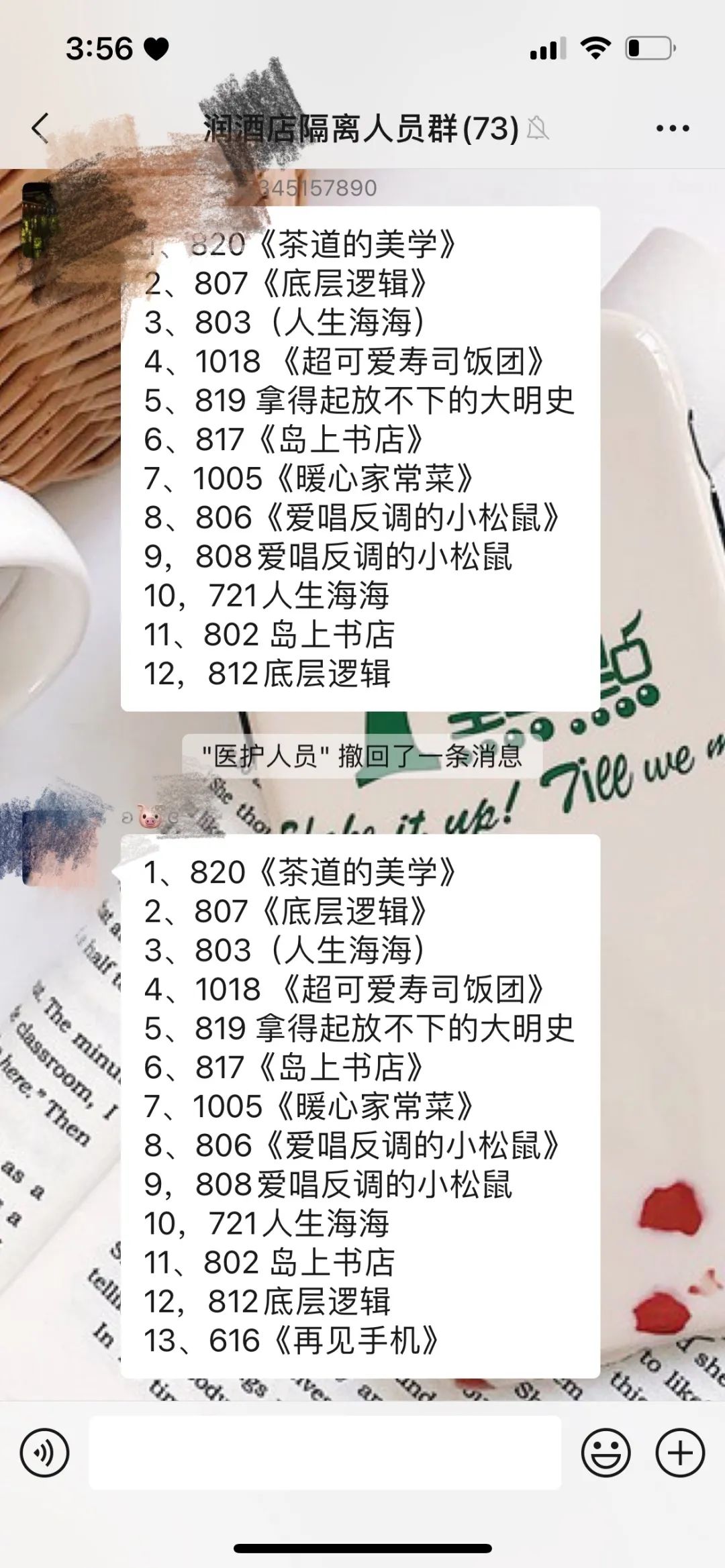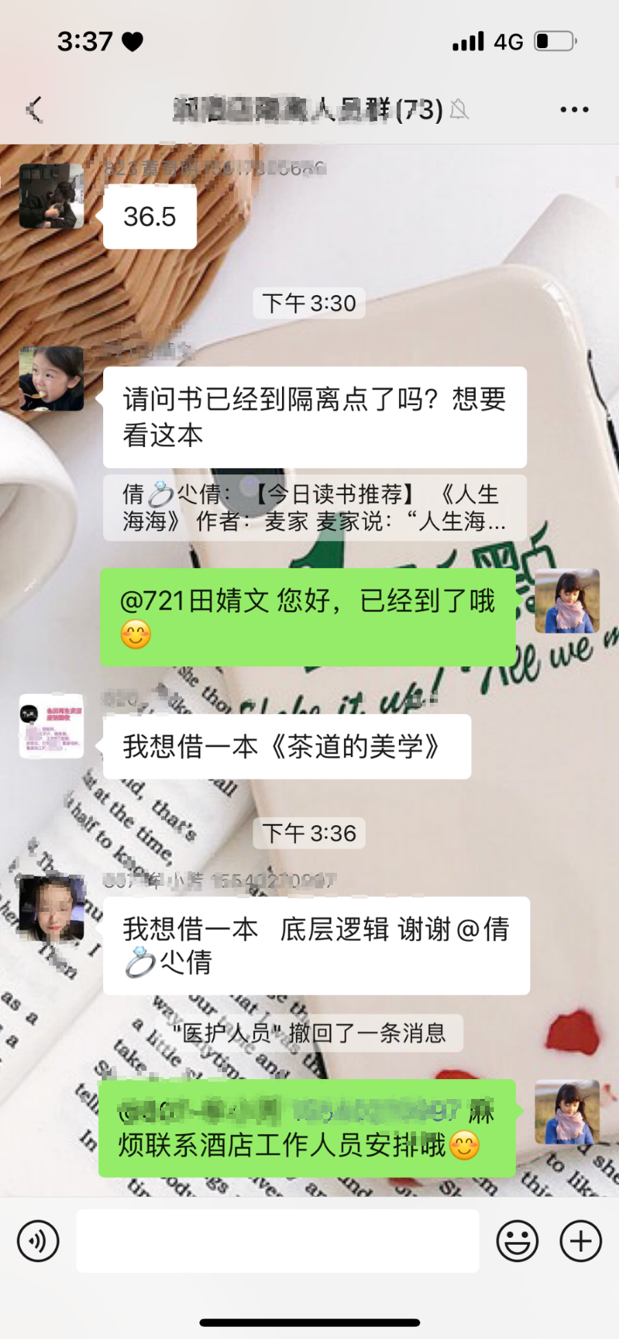 “妈妈,这个标题有意思,可以看一看!”据了解,针对隔离点内有小孩的情况,在各隔离点的赠送书单中,特地安排了一些儿童绘本。与此同时,各个隔离点微信群声音不停。“1007,《爱你就像爱生命》”“1009,《查令十字街》”“A1114,《人生海海》”“1207,《厨房新厨艺》来一本”……面对疫情,以“读”攻“毒”的特别方式,正在人与人之间传递着精神力量。