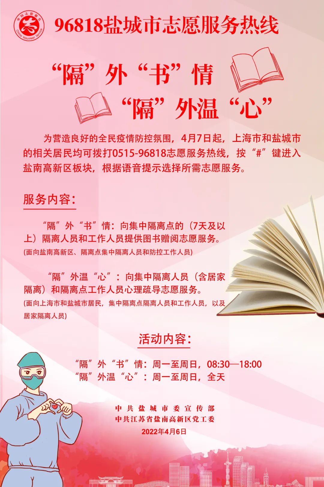 当前,全国疫情防控工作进入关键阶段和紧要关头。为充分发挥志愿服务力量,进一步营造良好的全民疫情防控氛围,做好全区隔离人员的服务工作,在盐城市委宣传部和区党工委的指导下,区宣传信息中心联合区志愿服务联合会、江苏励智健康服务中心在96818盐城市志愿服务热线开设“隔”外“书”情、“隔”外温“心”疫情防控志愿服务,相关服务于4月7日14:30,正式上线。