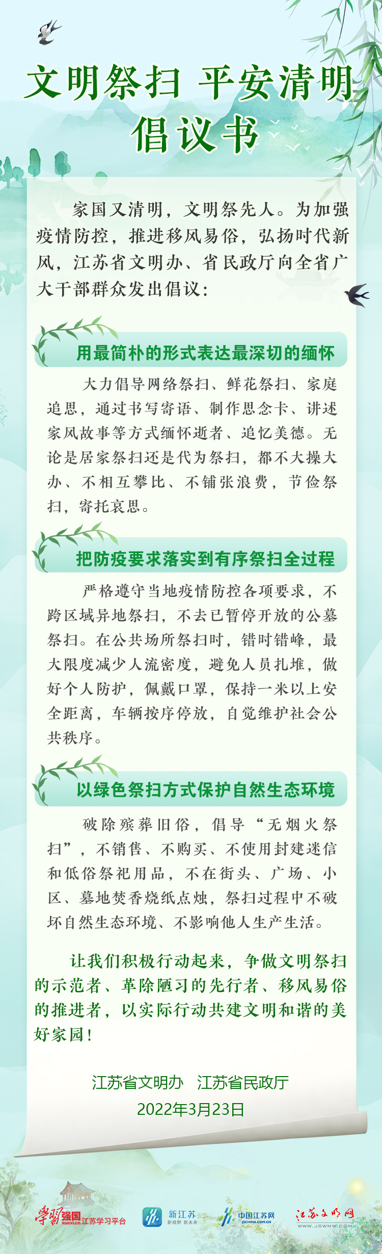 家国又清明,文明祭先人。为加强疫情防控,推进移风易俗,弘扬时代新风,江苏省文明办、省民政厅向全省广大干部群众发出倡议。