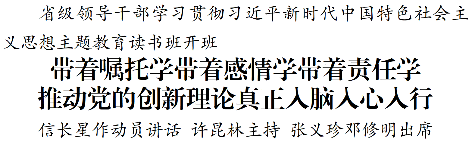 信长星强调,带着嘱托学、带着感情学、带着责任学,才能真正入脑,知其言更知其义,知其然更知其所以然;才能真正入心,内化为自觉、上升为信仰;才能真正入行,更好地改造主观世界和客观世界。办好主题教育读书班,省级领导干部要带好头、做示范,全省党员干部都要珍惜难得的学习机会,静下心来学,心无旁骛学,真正把马克思主义看家本领学到手,更好为党和人民履好职、尽好责。