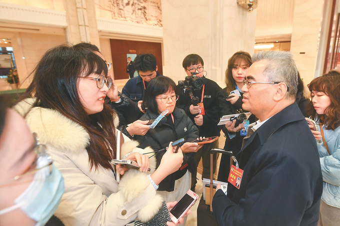 委员在住地华山饭店接受记者采访。 记者 王诗宇 赵亚玲 邵丹 摄