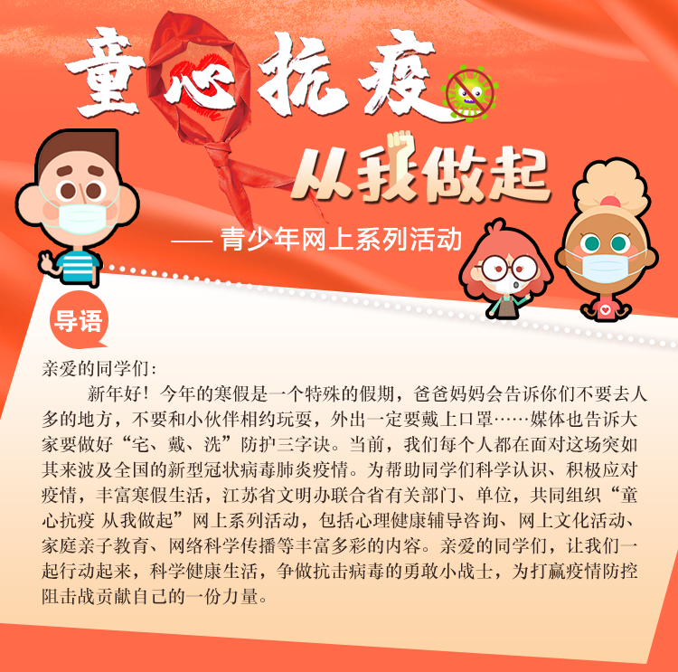 新年好!今年的寒假是一个特殊的假期,爸爸妈妈会告诉你们不要去人多的地方,不要和小伙伴相约玩耍,外出一定要戴上口罩……媒体也告诉大家要做好“宅、戴、洗”防护三字诀。当前,我们每个人都在面对这场突如其来波及全国的新型冠状病毒肺炎疫情。为帮助同学们科学认识、积极应对疫情,丰富寒假生活,江苏省文明办联合省有关部门、单位,共同组织“童心抗疫 从我做起”网上系列活动,包括心理健康辅导咨询、网上文化活动、家庭亲子教育、网络科学传播等丰富多彩的内容。亲爱的同学们,让我们一起行动起来,科学健康生活,争做抗击病毒的勇敢小战士,为打赢疫情防控阻击战贡献自己的一份力量。