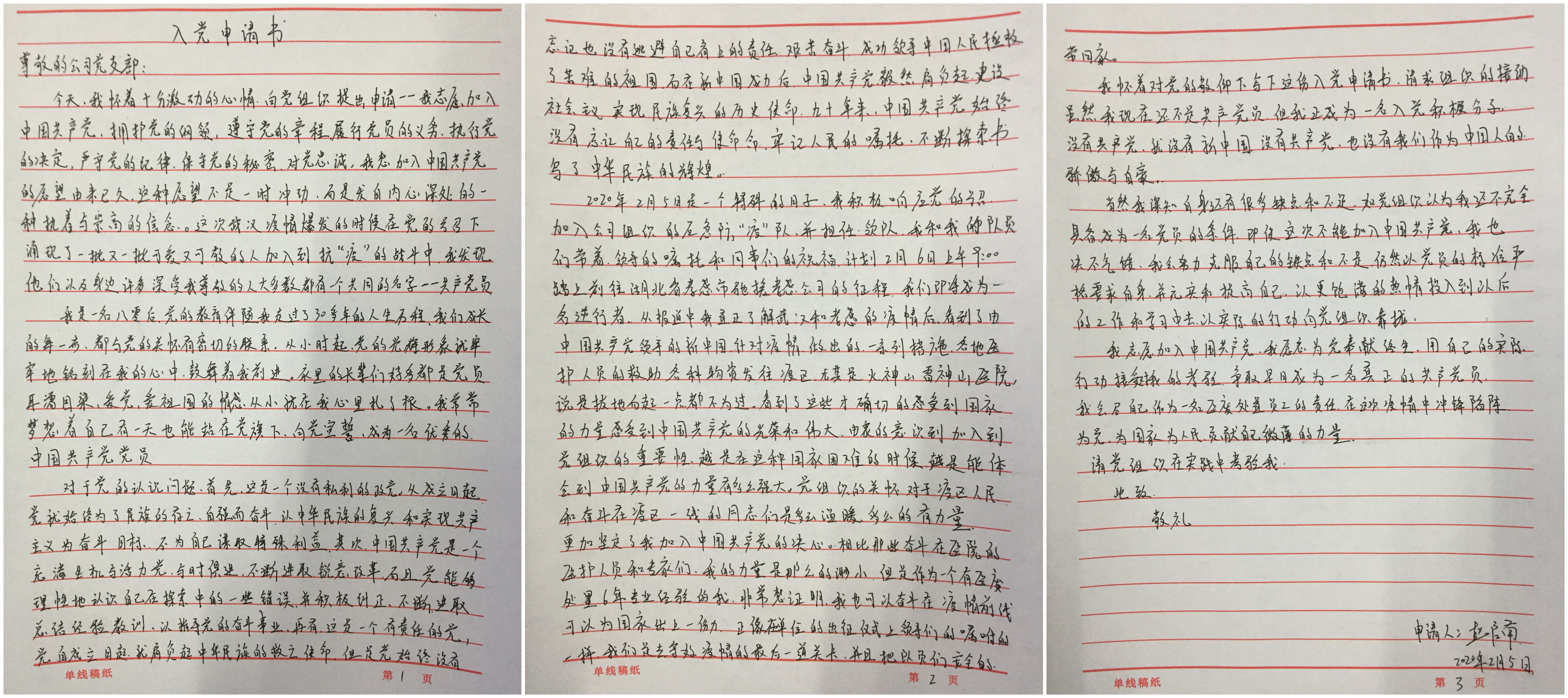 “越是在国家困难的时候,越是能体会到中国共产党的力量有多么强大,党组织的关怀对于疫区人民和奋斗在一线的同志们是多么温暖,多么有力量,更加坚定了我加入中国共产党的决心。”