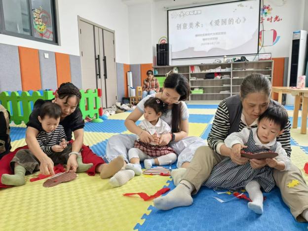 在创意美术环节中,孩子们通过搓、揉、贴等方式亲手制作《爱国的心》,不仅锻炼了手部精细动作,也在亲子协作中加深了对国家象征的理解。