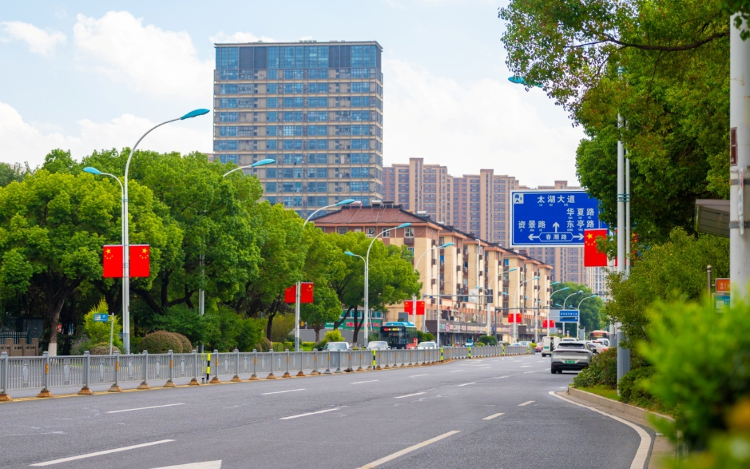 市级重点道路蔚为壮观!中山路、人民路、太湖大道等5条重点道路上无数面国旗构成磅礴的红色方阵,整齐划一,迎风招展。它们以中流砥柱的笔挺身姿,勾勒出城市最庄严的天际线,不仅树立了悬挂标准的典范,更奏响了国庆盛典的雄壮序曲。
