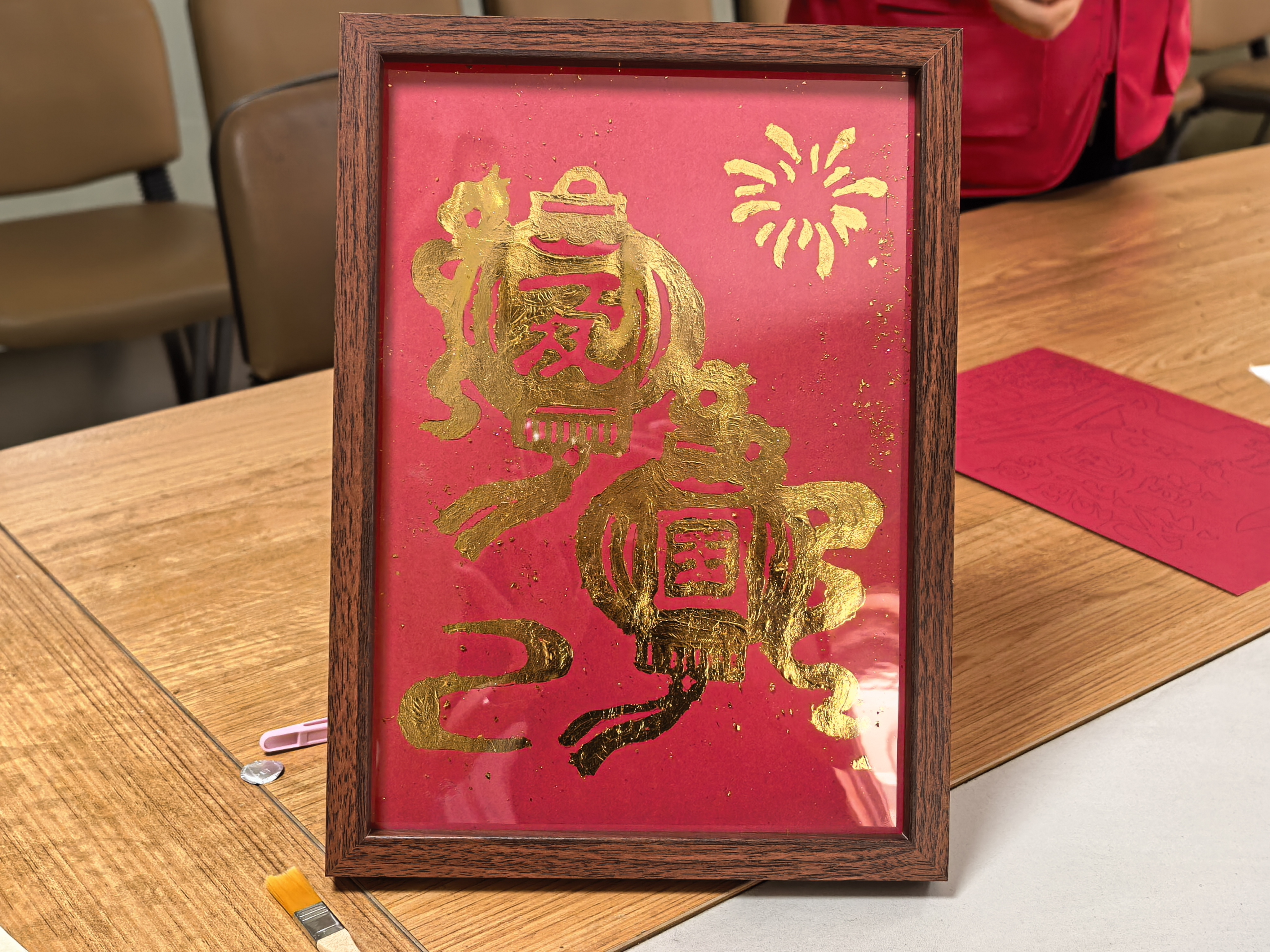 居民们听了志愿者的讲解跃跃欲试,各自选择了自己喜欢的图案,纷纷拿出材料包开始创作。“粘贴金箔的时候要轻轻按压,让金箔更好贴合画板。”志愿者不时为居民们提供指导,帮助居民更好完成作品。经过一段时间的创作,一幅幅精美的金箔画陆续完成了,居民们手持自己的作品,充满了成就感与幸福感。“没想到我能做出这么精美的作品,正如这幅爱国,祝福祖国越来越好!”居民欣喜地说。