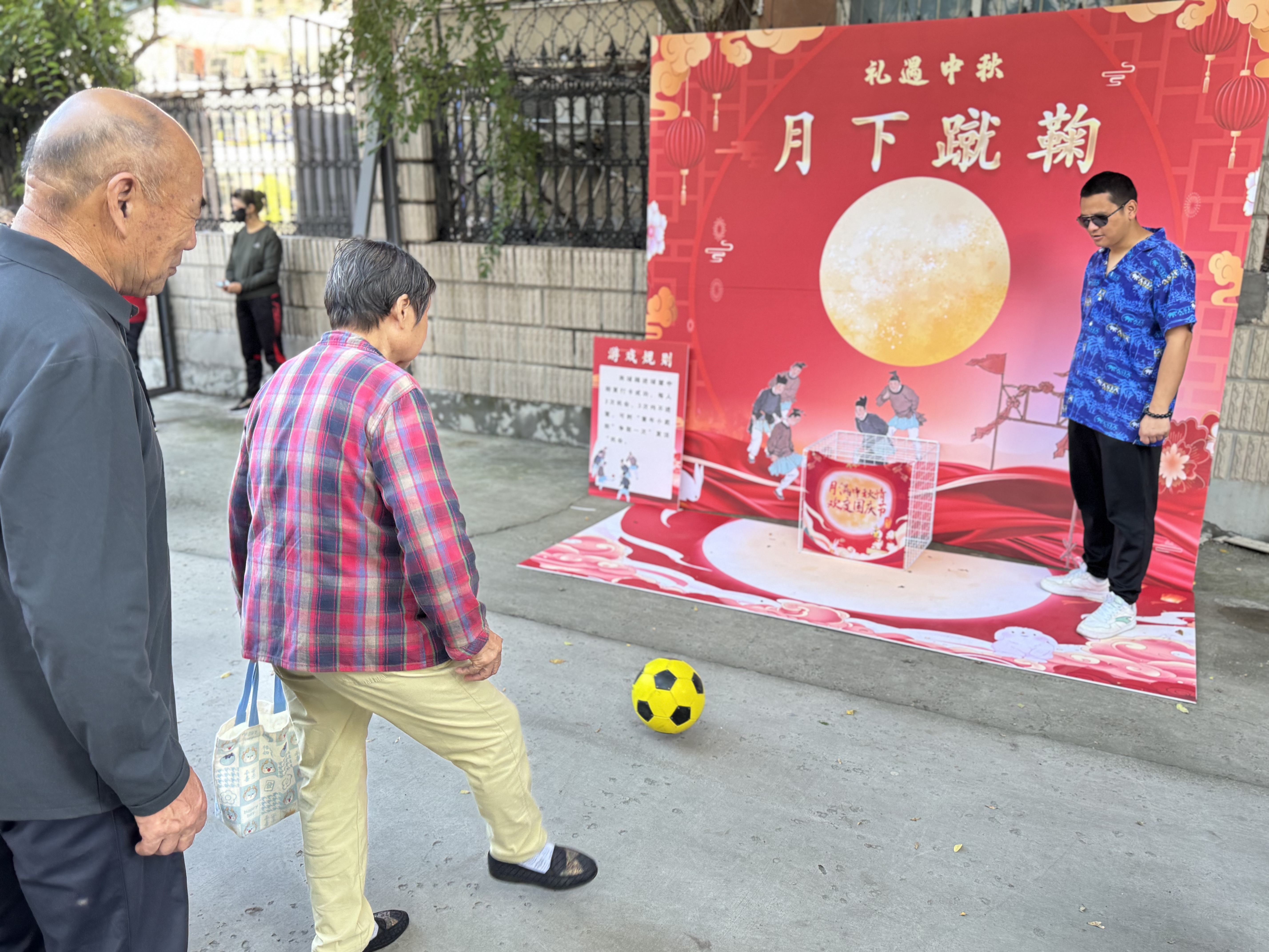 庆北社区在西站小区廊亭举办的“贺祖国华诞 赴明月之邀”时光派对活动同样热闹。活动当天,社区工作人员一身80年代复古装扮,瞬间将居民带入时光隧道。本次时光派对精心设计了三个趣味横生的环节:“月下蹴鞠”让居民们在秋月意象下重温传统运动的魅力;“海底捞月”挑战参与者的敏捷与默契,引得阵阵喝彩;而“旋转陀螺”则勾起了大家的青春回忆,邻里同场竞技,其乐融融。