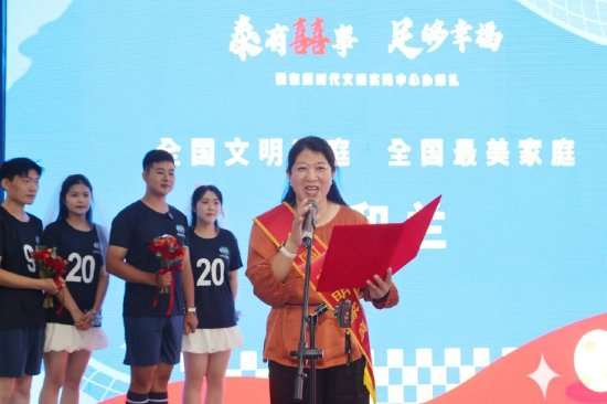 “婚姻的长久,是以理解为桥、以包容为基。”全国文明家庭代表吴和兰作为证婚人,为新人送上《文明婚俗倡议书》,分享她对幸福家庭的感悟。当天现场,更有足球教练周高萍与丈夫王晶送来祝福视频,寄语新人,传递相守相伴的婚姻智慧。