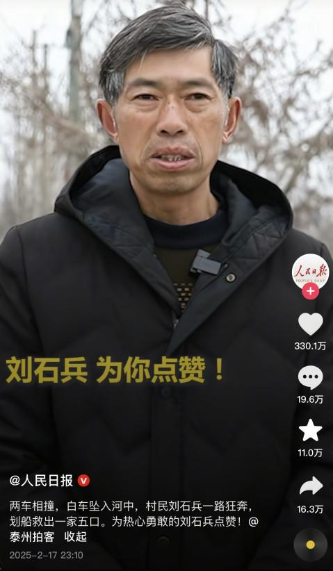 2025年2月11日清晨,泰州市医药高新区(高港区)胡庄镇刘荡村村民刘石兵跃入冰冷河水,成功救起五名落水者。现场视频经传播后,在泰州本地社交平台引发广泛关注。2月17日,《人民日报》抖音号转载该视频,收获超330万点赞,“泰州大叔”的英勇形象破圈传播。8月27日,2025年第二次“中国好人榜”发布,刘石兵入选“见义勇为”类身边好人。