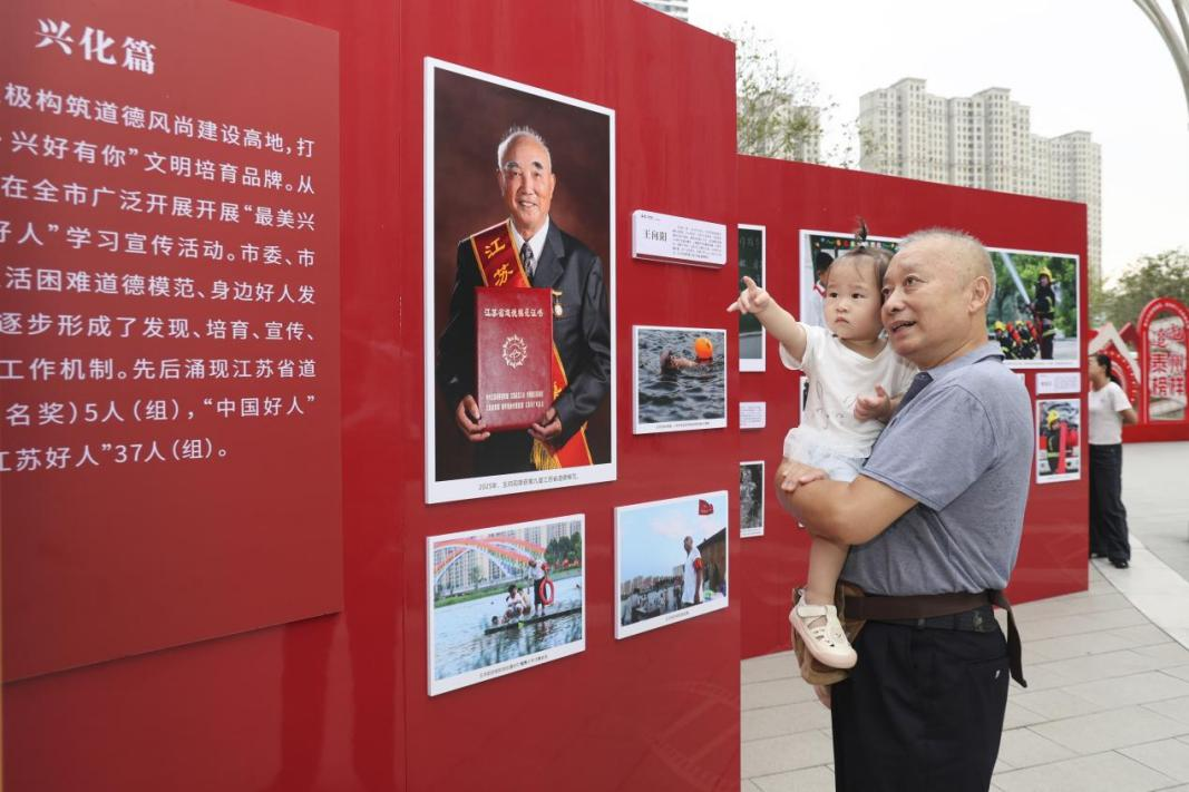 市民带孩子在“追光·泰州榜样”摄影展兴化篇展区,驻足了解道德模范事迹,传递榜样力量