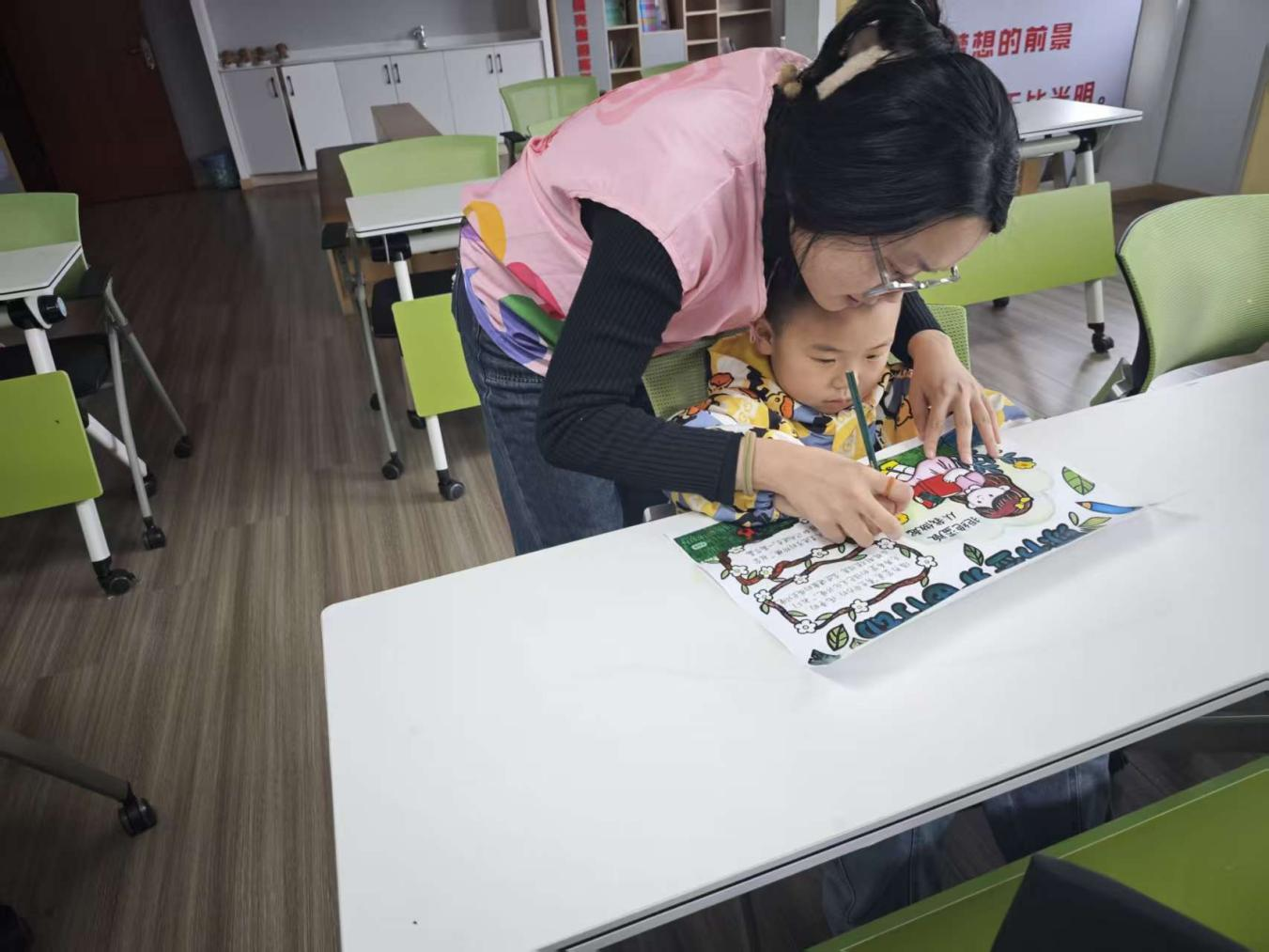 活动伊始,志愿者带领孩子走进“四季主题阅读”。老师朗读《四季的歌》片段,用“迎春花的嫩黄”“荷叶的碧绿”等文字勾勒四季,孩子们踊跃分享:“夏天能听蝉鸣吃西瓜”“秋天枫叶像小手掌”。绘画创作环节,志愿者结合读物讲解技巧:“春用嫩绿粉红,夏选深蓝翠绿,秋取橙黄棕红,冬择雪白浅灰”。孩子们挥笔创作:春园蝶舞、夏塘蛙鸣等,实践所化作创意乐园。“读了《四季的故事》,我画了一棵树的四季。”郑旭辰兴奋展示作品。家长张女士点赞:“阅读加绘画,既养习惯又提创意。”