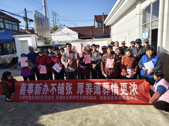 2025年11月25日上午9点,由南京市溧水区东屏街道主办,定湖社区承办的“茉莉花开·艺润溧水|喜事新办不铺张,厚养薄葬情更浓”宣传活动在定湖社区新时代文明实践站举办,通过发放宣传单页、现场讲解答疑等形式,向居民普及移风易俗新理念,倡导文明健康生活方式。