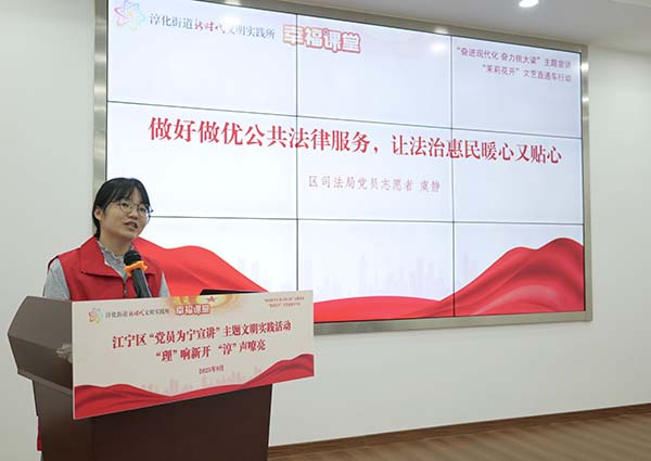 在“‘理’响新开,‘淳’声嘹亮”宣讲环节,多位党员志愿者轮番登台,带来一系列贴近民生、实用性强的主题分享。淳化街道新时代文明实践所所长钱云锋围绕党的二十届三中全会精神,结合街道实际进行深入解读;区科技局党员志愿者周岩以“AI科普‘慧’生活”为主题,生动介绍人工智能在日常场景中的应用,助力群众跨越“数字鸿沟”;区司法局党员志愿者虞静系统讲解公共法律服务内容,结合真实案例解析依法维权路径;区教育局党员志愿者李舒婷聚焦家庭教育难题,传授“非暴力沟通”四步法,为亲子关系“把脉开方”。