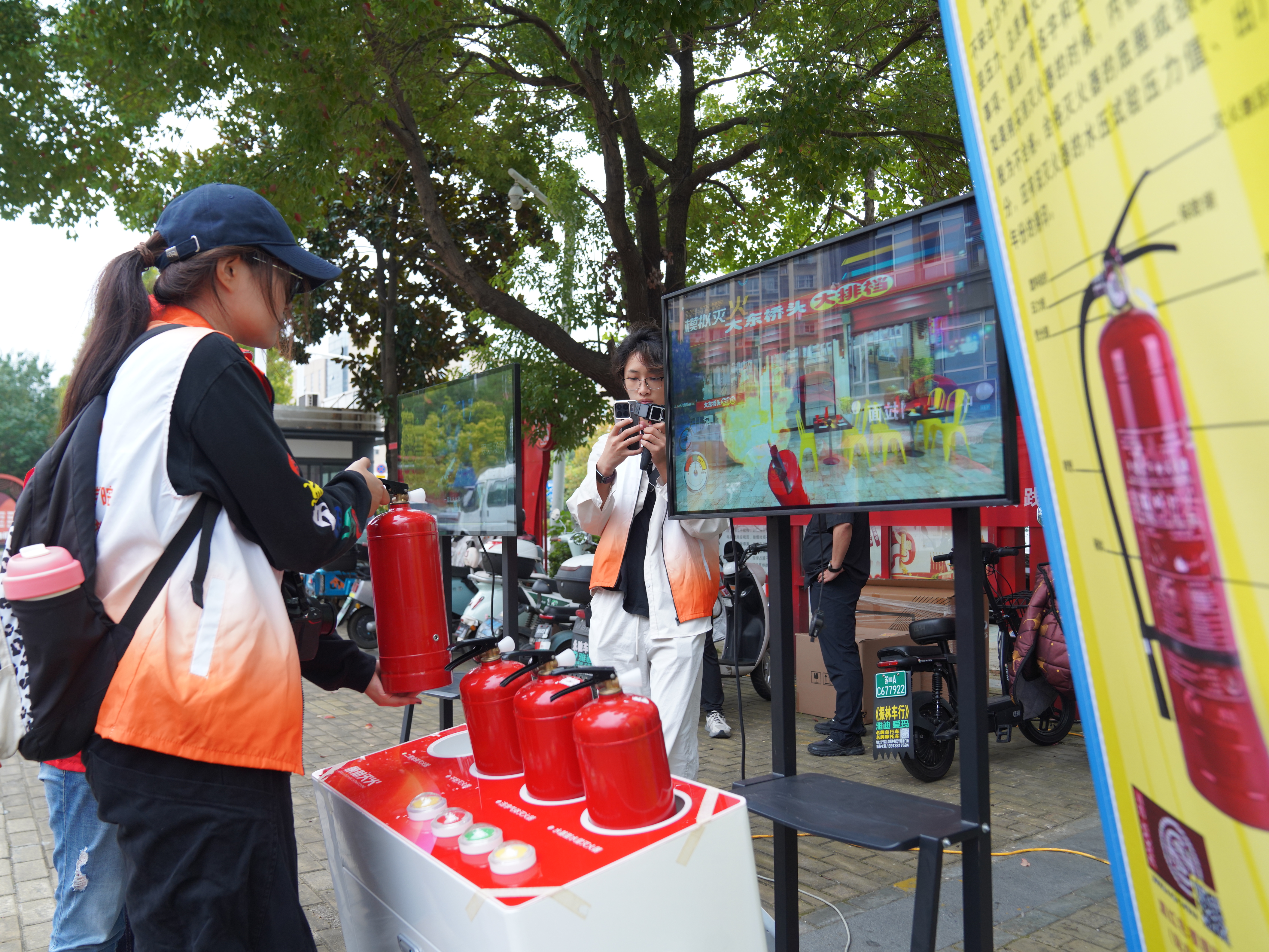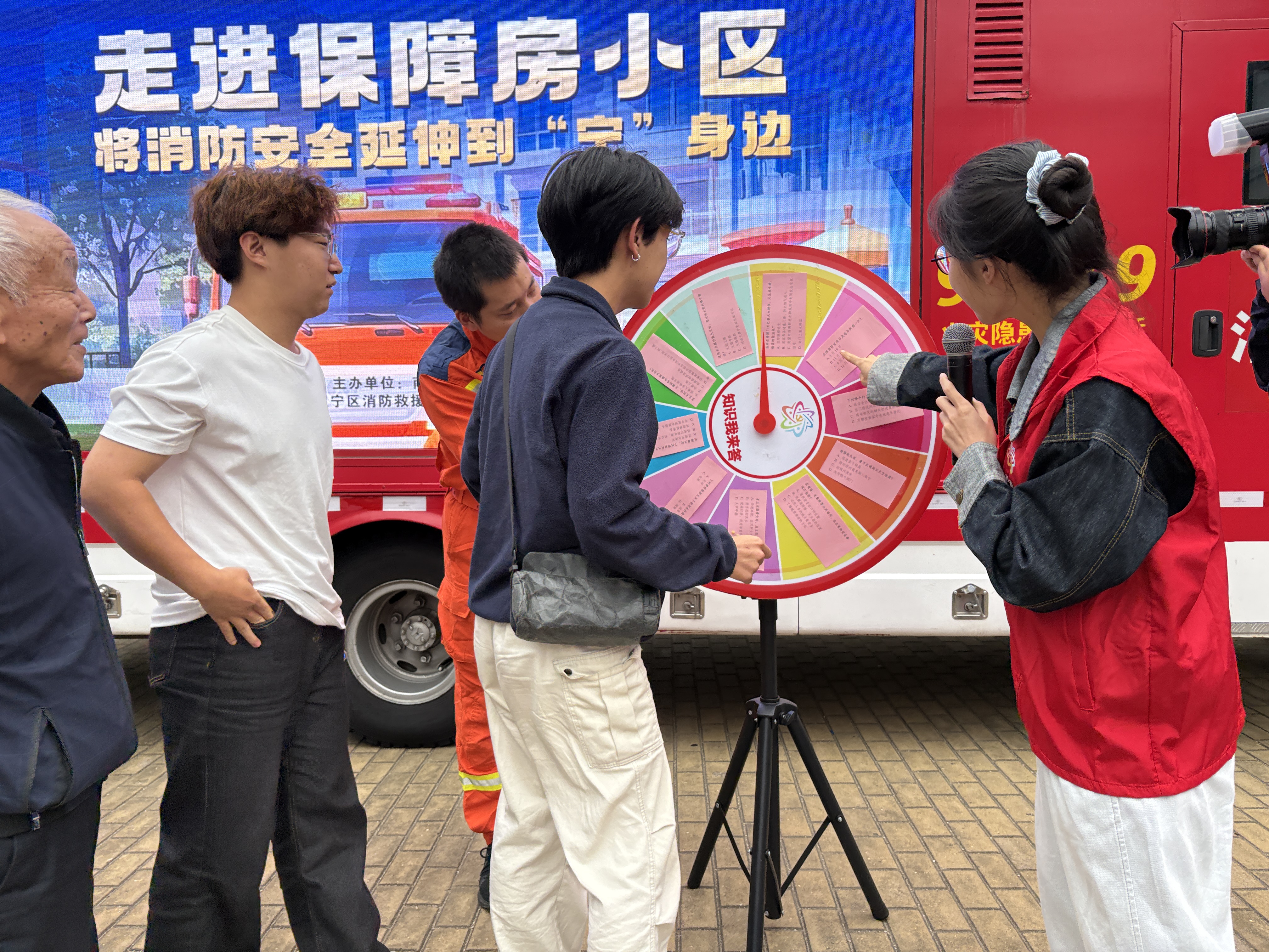 “现场互动区”早已聚集了不少前来参与的居民。江宁区消防救援大队的宣传讲师将停在广场上的消防宣传车作为 “移动课堂”,用通俗易懂的语言、真实的火灾案例,向居民们细致讲解了家庭火灾预防、电器安全使用、初期火灾扑救等核心知识,尤其针对保障房小区人口密度大、老年人占比高的特点,重点强调了厨房用火安全与独居老人居家防火注意事项,还介绍了灭火毯、灭火器等常见消防器材的使用方法,生动的讲解让在场居民频频点头。“下列哪种物质火灾不能用水扑救?”“发生火灾时,正确的安全疏散方向是?”随后,东山街道新时代文明实践所的志愿者通过知识大转盘互动,在寓教于乐中帮助居民掌握实用的消防技能。
