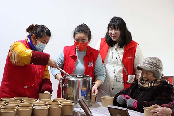 与此同时,厨房里粥香渐浓。志愿者们提前精心准备,将糯米、红豆、红枣、莲子、桂圆等十余种食材细心熬煮,制成香甜软糯的腊八粥。随着热气腾腾的粥碗被端到每一位长者手中,温暖也从指尖蔓延至心间。大家细细品味,笑意盈面。
