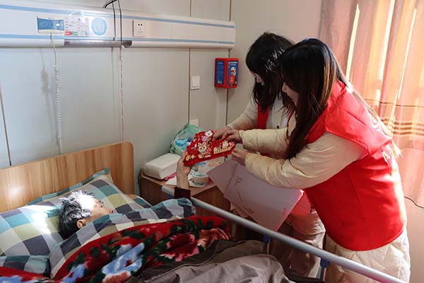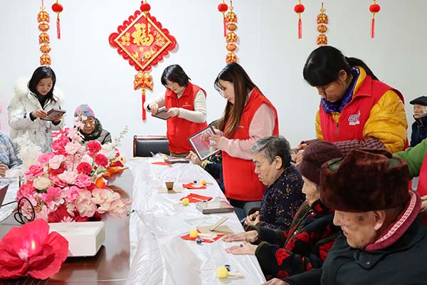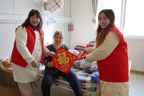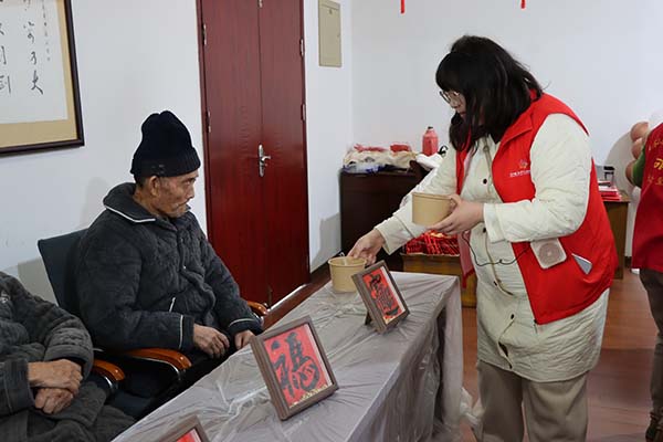 活动最后,志愿者给长者们送上福字和新春摆件,叮嘱长者要注意防寒保暖、保重身体,并提前送上新春的诚挚问候。红纸金字的福贴与精巧喜庆的摆件,为长者的房间增添了浓浓年味,更凝聚着社会真挚的关爱与祝福。