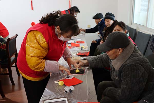 在随后的新春福字拓印手工环节,现场充满了欢声笑语。在志愿者的耐心协助下,长者们亲手铺纸、蘸墨、按压,一幅幅寓意吉祥的“福”字与喜庆图案逐渐清晰地呈现在红纸上。看着自己亲手完成的作品,长者们高兴地互相展示,并将这份承载着祝福的“福”气带回房间,也寄托了对新春佳节的美好期盼。