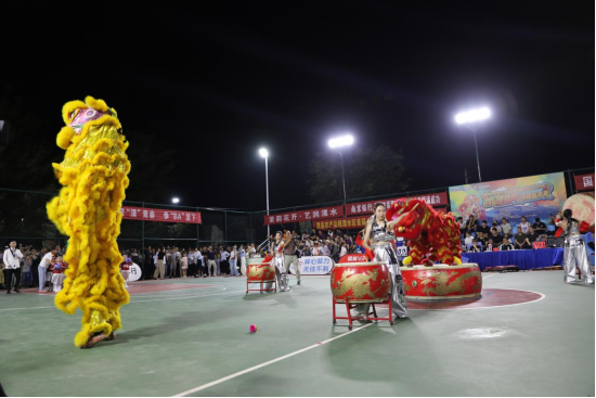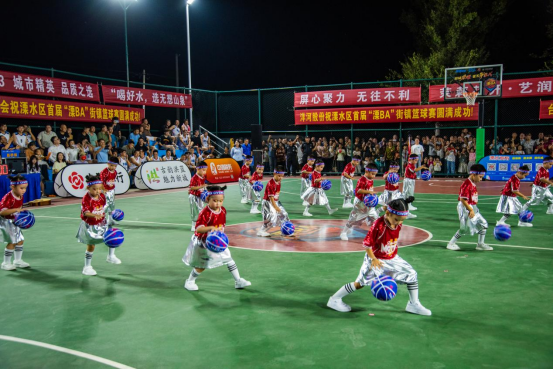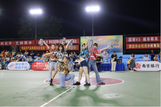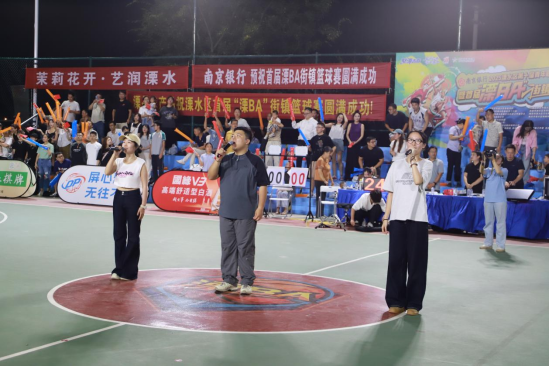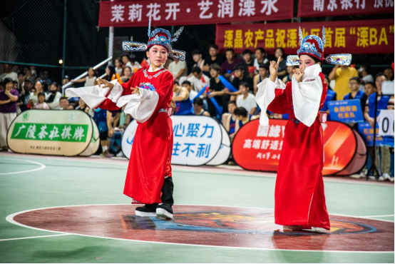 当天傍晚6:30,“茉莉花开·艺润溧水”文化惠民演出率先暖场。锣鼓铿锵,祥狮献瑞,精彩的舞狮表演用传统民俗的独特魅力,为现场带来满满的喜庆与活力,奏响赛事序曲。灵动可爱的幼儿篮球操《少年强则国强》、婉转悠扬的黄梅戏选段《女驸马》、活力满满的现代舞《热恋夏季》、充满少年情怀的流行歌曲《你曾是少年》等节目轮番上演,迅速点燃全场热情,掌声、笑声、喝彩声此起彼伏。文化惠民演出在大合唱《歌唱祖国》中落下帷幕,激昂的旋律与赛场紧张激烈的氛围完美契合,为球员注入无限动力。