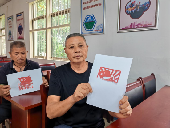 经过近两个小时的创作,一幅幅精美的剪纸作品陆续完成。有的作品是鲜艳的五星红旗,象征着对祖国的崇敬;有的作品是 “国庆快乐” 的字样,传递着节日的祝福;还有的作品将天安门、和平鸽与祥云元素结合,寓意着祖国繁荣昌盛、人民幸福安康。老人们拿着自己的作品,脸上洋溢着自豪与喜悦,纷纷拍照留念,记录下这一充满意义的时刻。