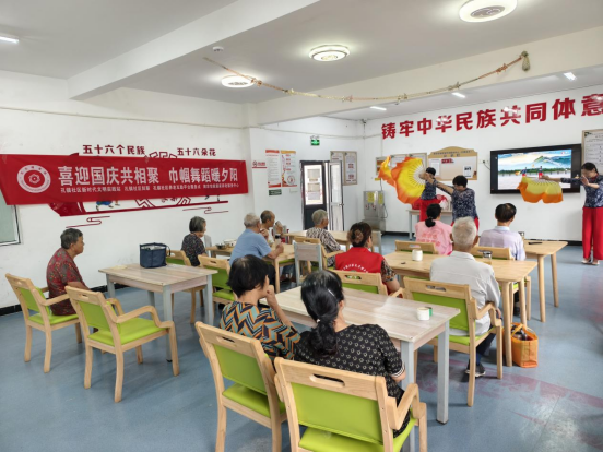 除了精彩的舞蹈展演,社区还精心设计了互动环节与贴心服务。在 “国庆知识小问答” 环节,工作人员提出关于国庆历史、祖国发展成就等方面的问题,老人们积极举手抢答,答对的老人还获得了社区准备的小礼品,现场欢声笑语不断。随后,社区志愿者与巾帼舞蹈队队员们还主动走到老人身边,与他们亲切交谈,询问他们的身体状况与生活需求,用真诚的陪伴驱散老人们的孤独感。