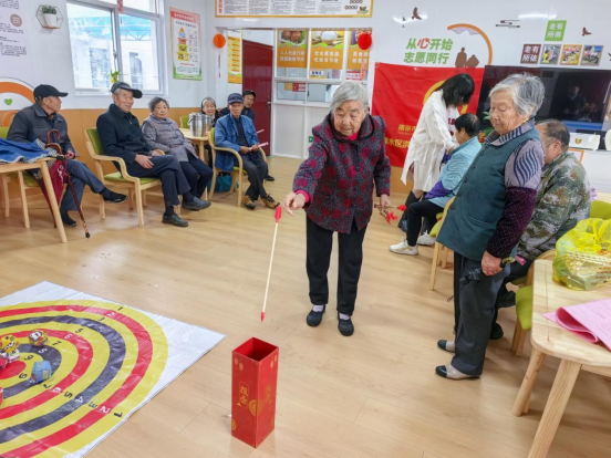 在趣味运动环节,志愿者带领老人们积极参与投壶、丢沙包等经典趣味游戏。投壶区域,老人们凝神聚力、瞄准投箭;丢沙包区域,大家躲闪腾挪、配合默契,欢呼声此起彼伏。老人们在运动中舒展身心,收获快乐。